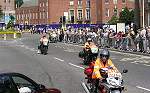 Description : The rest of the riders start to arrive in Derby Image Reference No. : DP-030904TOUROFBRIT-09 Date photo taken : 3rd September 2004 Other Information : Seconds later, these safety bikes arrives to stop all traffic ready for the mass of riders to come through the centre of Derby. |